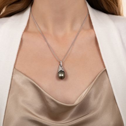 This artsy, sleekly sculpted modern jewel presents a sizable (18 by 14.6 mm) South Sea Pearl from the crystalline waters of Tahiti. The unique ocean gem--imbued with an enchanting iridescent coloration of steely gray with greenish overtones and hints of rose-- is capped with a platinum wrap aglitter with over one carat of sparkling white round brilliant-cut diamonds. A striking and exotic beauty. Platinum chain adjusts to 17 1/2 inches.