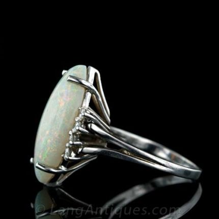 An attractive, high-profile, estate fun ring featuring a sizable marquise shape opal displaying a full palette of pastel rainbow hues. This unique opal is elegantly set is a light wire setting of 14 karat white gold and is flanked by four bright, brilliant cut diamonds on each side.