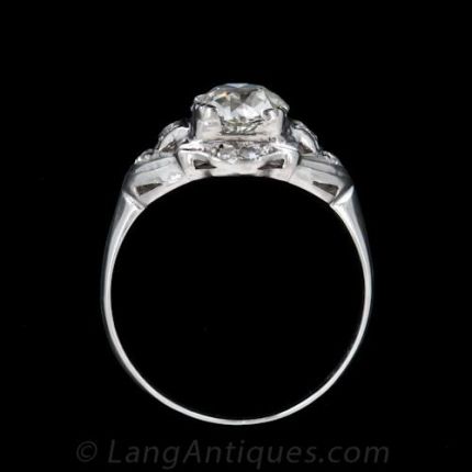 A glittering 1.00 carat European cut diamond set with claw prongs is the star of this stand out platinum Art Deco engagement ring with sophisticated geometric embellishments. Original, circa 1930s.