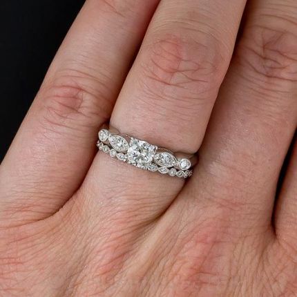 Beautifully crafted in platinum, this striking engagement ring is set with a .40 carat E color and VS1 clarity European-cut diamond. We rarely see this high color in European-cut diamonds from the early-20th century, so this ring is very special. Keeping in theme with the Art Deco period, the diamond is set in a square-shaped head with sculptured triple prongs on each corner. The geometric navette- and round-cut diamonds extend the Deco design across the shoulders. This ring is shown with our diamond wedding band number 110-1-3820 that can be special ordered in your size.