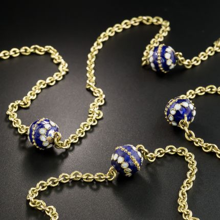 Ten cobalt blue enameled balls wrapped with double rows of white enamel polka-dots intersperse a 62 inch long (5 feet+!) 15K yellow gold (hence of British origin) neckchain in this fun and festive vintage adornment. Wear it doubled, tripled, of full length. If you're sentenced to wear a ball & chain this is an excellent choice!