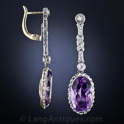 1 and 1/2 inches long and lithesome vintage drop earrings gleaming with elongated oval amethysts set in slender, finely milgrained scalloped frames. The articulated platinum and diamond-set tops are crafted in five distinct sections; the amethysts are set in platinum over 18 Karat yellow gold. Exquisite.