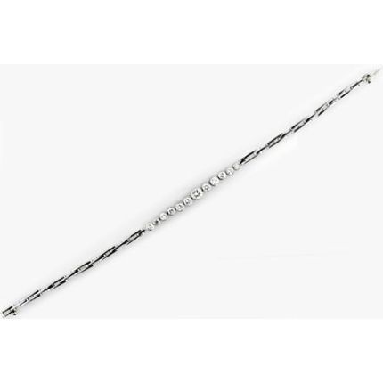 Thirteen glistening round brilliant cut diamonds are bezel set in the center of slender geometric link bracelet in platinum. Appropriate for a host of occasions. This bracelet measures about 6 1/2 inches long.The Diamonds are described as follows:Thirteen Round Brilliant Cut DiamondsWeight: .95 carat total weightColor: H-IClarity: SI-I1