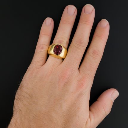 Often misidentified as a ruby, the splendid radiant red spinel is an exceptionally fine stone in its own right. With their perfect crystal formation, purity and vibrancy of color, the Burmese described spinels as having been "polished by the spirits." Because of its indisputable beauty and depth of color, the stone was used prominently to adorn crown jewels, one of the most famous being mounted directly above the renowned Cullinan II diamond in the Imperial State Crown of the United Kingdom. The captivating stone in this dramatic estate ring gleams and glows with an intense, fiery claret red color, enhanced by its brightly polished mounting, substantially rendered in 18K gold. A rare, radiant and highly collectable specimen. Currently ring size 10 3/4.