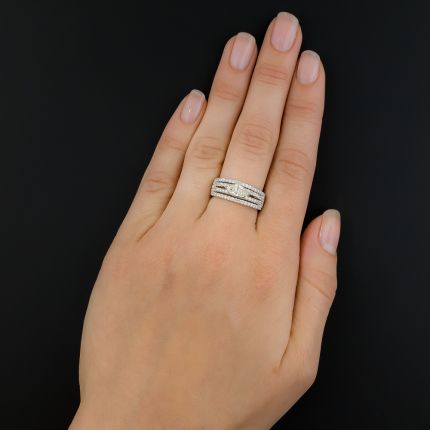 Four rows of glittering icy white round brilliant-cut diamonds are embellished with a sunshiney, horizontally set .64 carat marquise diamond in this sleek and stylish estate ring. Total diamond weight, 1.19 carats. In platinum, currently size 6 1/2.