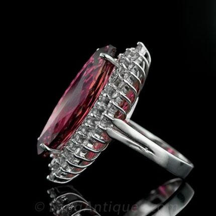 A magnificent marquise-cut Rubellite tourmaline weighing over 12 carats displays a vivid cranberry color. Adding a dramatic contrast are the surrounding brilliant-cut diamonds which total 2.80 carats.The custom 14 karat white gold mounting consists of a tiered prong style cluster top having a flared wire undergallery which integrates with a brightly polished shank. This very special ring is in excellent condition and is a size 6- 1/2. The gemstones are described as follows:Fifty Eight Round Brilliant-cut DiamondsWeight: 2.80 carats total Color: J-K-LClarity: I1 Marquise TourmalineWeight: 12.41 caratsDimensions: 27.0 mm x 10.7mm x 6.0mm