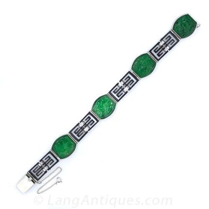 An enchanting, exotic and rare vintage bracelet from the highly individualistic and exceptional San Francisco jeweler Marsh & Company. Rendered in the Marsh & Co. trademark blackened steel and 18k white gold, four translucent green jade plaques alternate with chinoiserie style geometric links, each twinkling with tiny single-cut diamonds. Hand engrave sides complete this exemplary Art Deco bracelet, circa 1930.