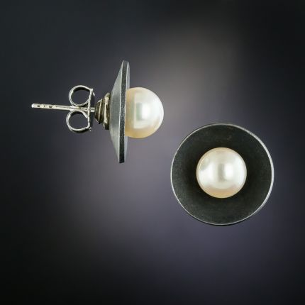 By the renowned and collectible early-to-Mid-20th Century San Francisco jeweler with a signature style--Marsh & Co.--cool, artsy, and minimalist ear studs composed of cultured pearls set in blackened steel disks. 5/8 inch diameter.
