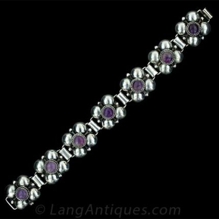 Mexican silver link bracelet with seven artistic links centered with round cabochon amethysts. Stamped Mexico Silver. Circa 1950's-1960's.