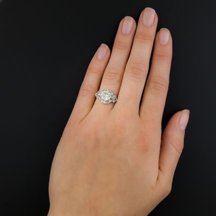 This is a stunning stand-alone platinum diamond Mid-Century engagement ring with a slight Deco feel. The center 1.59-carat European cut diamond displays a warm, fiery glow and is fully surrounded by a decorative framework design encrusted with glittering accent diamonds. A grand and sparkling head turner. Total diamond weight, 1.89 carats. Center stone accompanied by a GIA Diamond Grading Report stating: O-P - color; VS1 - clarity. Die struck in platinum, currently ring size 6.