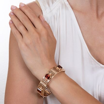Light and lacy gently curved filigree links, each accented with a gleaming cognac-colored emerald-cut citrine and a pair of tiny orange blossom flowers, connect to create this marvelous Mid-Century wrist adornment. Total citrine weight, 17.60 carats. In 18K rosy-yellow gold, it measures 5/8 by 7 1/4 inches.