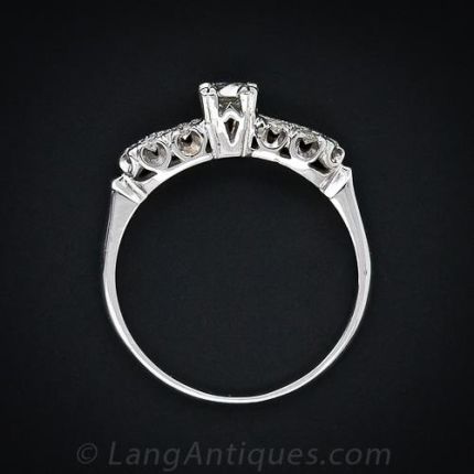 A delightful small scale diamond engagement ring from the mid century. The center old mine cut diamond is a .25 carat sparkler set with claw prongs and highlighted by two rows of diamonds set on either side in classic fish tail prongs.