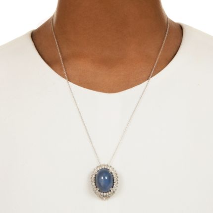 This big, bold, beautiful bauble, dating back to the 1950s-60s, evokes the glamorous jewels of Golden Age Hollywood. Starring a high-domed cabochon sapphire, weighing in at 45 carats, the rich cornflower blue gemstone is gifted by Mother Nature with a gemological phenomenon called 'asterism' (aka the star effect). The shimmering sapphire glistens and glows from within a sparkling halo of small bright white round brilliant-cut diamonds inside a 'ballerina' skirt composed of 28 sizable straight and tapered baguette diamonds totaling 2.30 carats. The clever 'ring-dant' mechanism by Palais converts from a ring into a pendant. 1 1/4 inches by just shy of 1-inch wide. Accompanied by a GIA Gemological Report stating: Natural, No Indications of Heating; Geographic origin - Sri Lanka (Ceylon) origin.