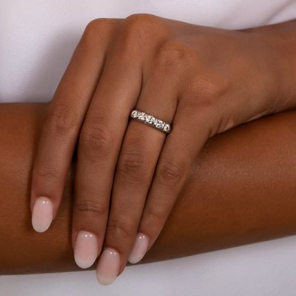 A quintet of bright white round brilliant-cut diamonds sparkle atop this classic mid-20th-Century wedding band, crafted in lustrous platinum with characteristic fishtail settings. Total diamond weight, .60 carat. The sleek knife-edge ring shank is currently size 6 1/4.
