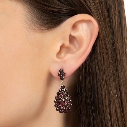 Boho chic is always in vogue. Taking a cue from the past, these Mid-century jewels create sassy motion at your lobes courtesy of cluster dangles, each centered by a Cabernet-colored pear-shaped garnet that gleams in the midst of rose-cut garnets, all of which swing from garnet-set quatrefoil posts. Time to pull out your flowing flower-print maxi skirt. Crafted in gilded metal.