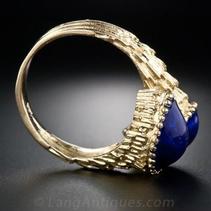 This unusual fashion ring probably dates back to the 1960s. Two deep blue enamel teardrops (with some light wear), which resemble lapis lazuli, nuzzle each other in a stylized, feather-textured, 18K yellow gold mounting. Lots of color!