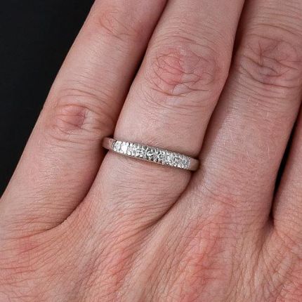 Nine diamonds sparkle across the top of this mid-century 3mm wedding band. A perfect match for a sleek and elegant modern engagement ring.
