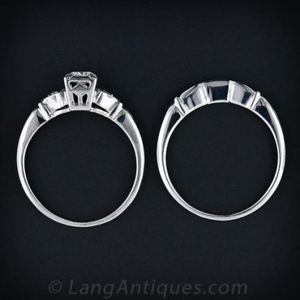 A sweetheart of a wedding set! The platinum diamond engagement ring is set with a .17 carat round brilliant cut diamond in an illusion head mounting embraced by two tiny diamonds set in heart motif settings. The matching band is 14 karat white gold.