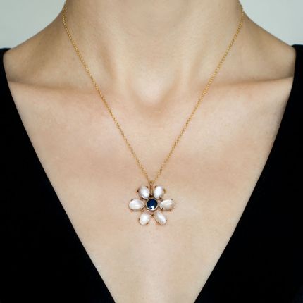 Six moonstone petals--with a billowy, bluish moonlight-like sheen--gleam and glow all around a glorious 1.20 carat cobalt-blue sapphire. The charming Mid-Century pendant suspends from an 18-inch chain. A blooming beauty. Hand-fabricated in 14K gold. Gemological report from Stone Group Laboratories states: Natural. No indications of Thermal Enhancement. Pailin, Cambodia - origin. In the world of sapphires, those closest in color to Kashmir (the rarest and most coveted) and Burmese (close runner-up) originate from Pailin, Cambodia.