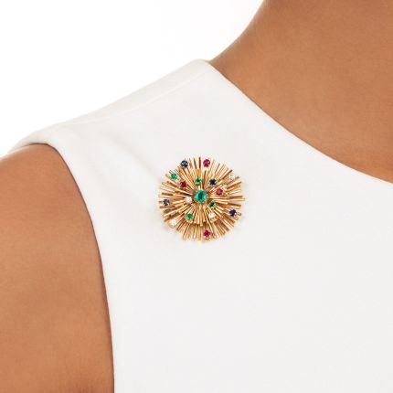 Reminiscent of a mid-century wall sculpture by Curtis Jeré (for one), this miniature work of modern art is weightily crafted in gleaming 18K gold wire and explodes with a profusion of randomly arrayed gemstones: emeralds, diamonds, rubies, and sapphires. Fun, festive, and absolutely fabulous! Total gemstone weight, 1.65 carats. Hand fabricated, it measures 1 3/8 inch in diameter.
