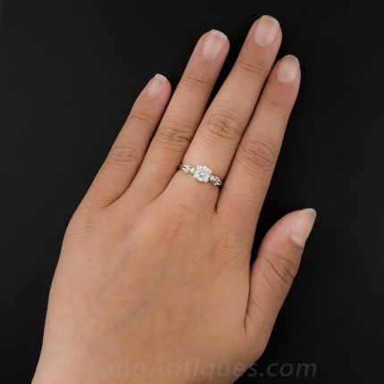 This distinctive vintage dazzler, hand-fabricated in platinum during the 1930s-40s, sparkles front and center with a bright-white and beautiful European-cut diamond weighing .72 carat. The scintillating center stone is secured by four trefoil prongs and is embellished on each shoulder with a pair of glittering collet-set single-cut diamonds leading to a striking split ring shank. Singular and stunning. Currently ring size 6 1/4.