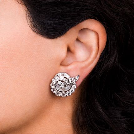 These breathtaking, high-octane diamond sparklers will light up any room with just shy of 10.00 carats of bright-white, round brilliant-cut diamonds and ribbons of gleaming baguette diamonds which gracefully spiral around marquise diamond centers. Measuring 7/8 inch, these superlative multi-dimensional earrings were masterfully hand fabricated in in platinum during the late 1950s-early 1960s. Gorgeous!