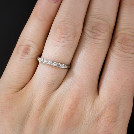 A crisp and classic vintage wedding band, with six high-quality, bright and glittering single-cut diamonds in prong settings. Finely crafted in lustrous platinum, with a sleek knife-edge shank, finger size 7.