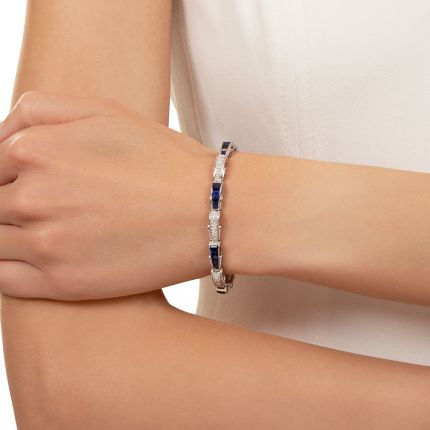 Flared, slightly domed links, set with gleaming cobalt-blue sapphires and icy-white round brilliant-cut diamonds, create a series of gently cresting 'waves' to wrap your wrist by way of this exquisite estate bracelet based on the iconic Oscar Heyman Bros. original from the 1920s-30s. Total diamond weight - 2.00 carats, total sapphire weight - 5.50 carats. Crafted in platinum, circa the 1950s-60s, measures 6 1/2 inches. Clasp is 14K white gold.