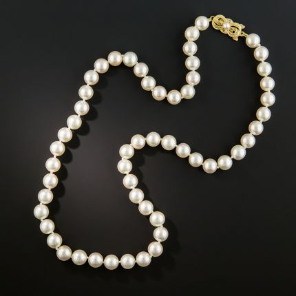 Pearls--they inspire such colorful imaginations of the mind. In ancient Japan, pearls were thought to be the tears of fanciful creatures such as mermaids or nymphs. While we're not sure if Japanese entrepreneur, Mikimoto Kōkichi*, had any of this in mind when he opened his first pearl shop in 1899, true pearl aficionados throughout the years have desired to add a strand of Mikimoto pearls to their jewel boxes. This is the perfect strand. Fifty-five ultra-lustrous, nearly perfectly round cultured pearls measuring between 7.5 and 8 mm are knotted together to form this 19-inch necklace, finished with a decorative 18K gold clasp accented with a small pearl. Classic and current--always. *Mikimoto Kōkichi was a Japanese entrepreneur who is credited with creating the first cultured pearl and subsequently starting the cultured pearl industry with the establishment of his luxury pearl company Mikimoto.
