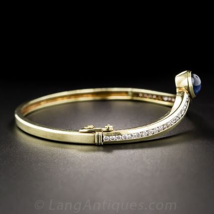 A contemporary chevron shaped design bangle bracelet is rendered in brightly polished 14 karat yellow gold. The bracelet is channel set with brilliant-cut diamonds accenting a bezel set cabochon blue sapphire displaying a tranluscent body color. A white gold plunger clasp and yellow gold safety latch secures this highly wearable piece.