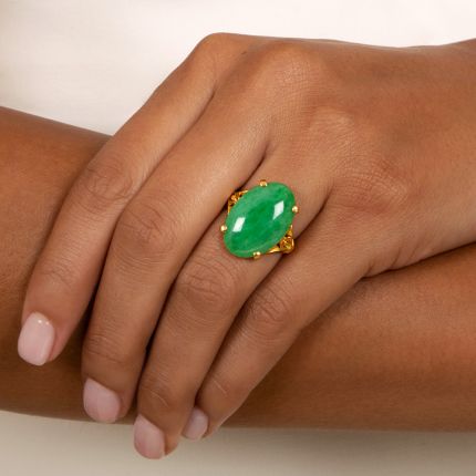 A lovely natural bright translucent apple green double-cabochon jade displays its beauty atop a mounting die-struck in high-carat gold, in this understated--yet striking--estate ring. For a subtle finishing flourish, the elegant split shoulders are each adorned with a tiny bloom. Mid-20th-century vintage. Just over 3/4 inch. Accompanied by a gemological report from Stone Group Laboratories stating: Natural. Myanmar (Burma) - Origin. Currently ring size 5 3/4.