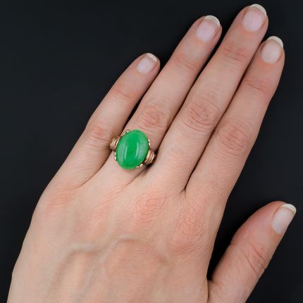 Translucent, intense apple green well describes this striking, natural, untreated (A Type) Burmese jade cabochon. The patina on the 14K rose gold mounting adds increased dimension and compelling intrigue to the brightly colored jewel, designed and hand fabricated in the 1940s in classic Victorian revival style. The jade is accompanied with an identification and origin report from Stone Group Labs verifying UNTREATED, Burmese origin. Sophisticated simplicity. Currently a ring size 6 1/2.