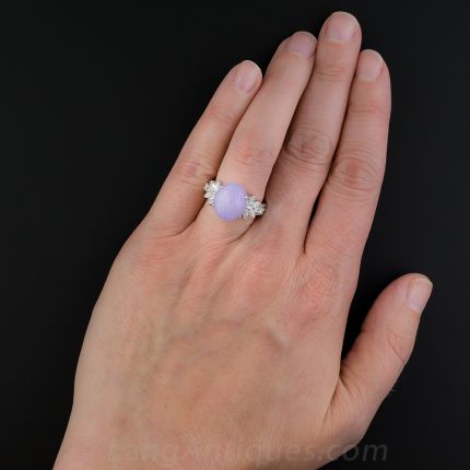 A natural Burmese jade cabochon, imbued with an enchanting vibrant violet, or lavender hue, is embraced on each side with sparkling diamond sprays composed of small bright white marquise and round brilliant-cut diamonds, all presented in a sturdy, gleaming platinum mounting. Accompanied by a gemological report from Stone Group Laboratory stating: Natural. No indications of polymers or dyes. Burma origin. The striated ring shank is currently ring size 6.
