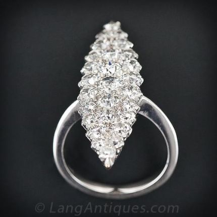 This platinum and diamond dazzler from the turn of the twentieth century measures 1 1/2 inches long. 27 bright white European-cut diamonds, totaling 3.00 carats, are tightly packed for maximum impact in this fabulous vintage dinner ring.