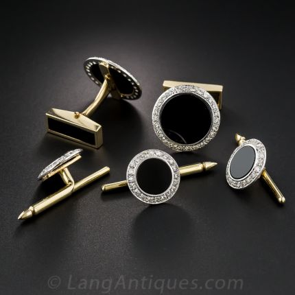 A contemporary take on classic 1920s Art Deco style. Crafted in two-tone yellow and white gold, glossy black onyx discs are encircled with sparkling white diamonds. For a nice touch, the swivel-backs of the cufflinks are inlaid with onyx. Three shirt studs.