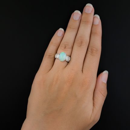 A fabulous gemstone: a wondrous white opal suffused with a multi-chromatic array of entrancing pastel hues - primarily blues and greens with flashes of orange and yellow (photos can't do this one justice), glows in high-profile between scrolls of icy-white baguette and round brilliant-cut diamonds, all presented in a sturdy platinum mounting. Currently ring size 6.