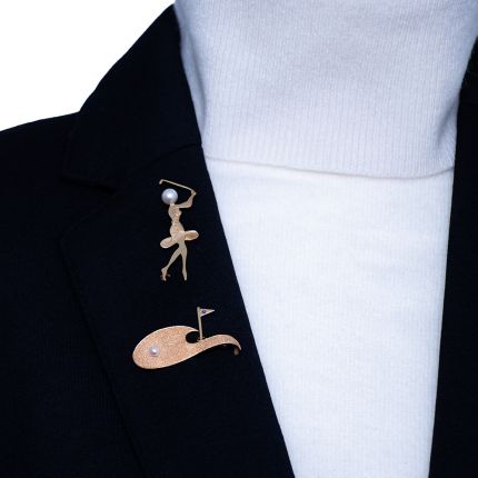 A skilled and sexy female golfer lands a shimmering cultured pearl right smack on the green in this very clever and extra-charming two-piece pin set by the incomparable jeweler to the stars of yesteryear - Ruser of Beverly Hills. Fore!