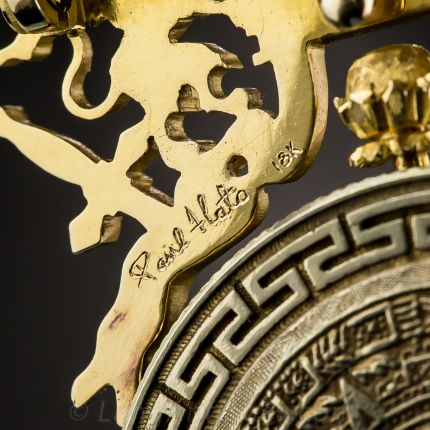 From the distinguished, and colorful (to say the least) storied Jeweler To The Stars, formerly of Hollywood, NYC and Mexico City - Paul Flato - comes this coveted, signature jewel - a timepiece/brooch and pendant - "Imperio Mexicano". Centering on a 1 peso pendant brooch watch, featuring a skeleton (or see through) 1 peso dial, dated 1866, with delicate black filigree hands, and a solid back depicting an Aztec calendar. The coin edged case is topped by an 18k yellow gold imperial crown guarded on each side by a pair of griffins, a sword and scepter. 17 jewel manual-winding straight line lever movement, and 38mm, case in 18k gold and silver vermeil, with a bale and pin stem at top portion of case back so it can be enjoyed as both a pendant or brooch - circa 1960's, signed Paul Flato.