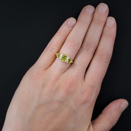 The color of bright green summer grass, the three peridots in this cheerful Victorian-style ring, together weighing 1.63 carats, are united by two pairs of bright white diamonds. It's sure to lift your spirits on a rainy day--or any day. Total diamond weight, .16 carat. Newly crafted in 18 karat gold, and hailing from London, England (according to the hallmarks). Currently a size 7 1/2.