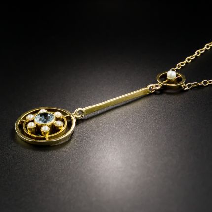 Something light, airy, and pretty to grace your neckline. A simple double circle, centered with a clear blue aquamarine orbited by seed pearls, is joined to a smaller pearl-centered circle in this darling Art Nouveau necklace. Aquamarine weighs .45 carat. Hand fabricated in 15ct gold. 9ct chain measures 15 inches.