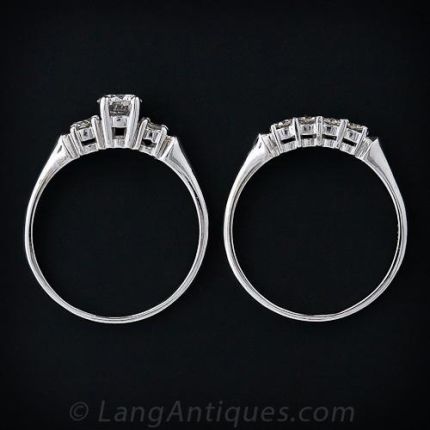 A sweet and petite classic Mid-Century diamond wedding set centering a .30 round brilliant cut diamond. The rings twinkle with single cut diamond accents in both the engagement and wedding band. This diminutive is constructed in 14 karat white gold with tapering bands.