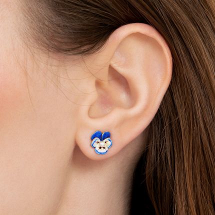 Is there anything sweeter than this darling pansy necklace and earring set? We think not. Rarely seen in such a petite size (or en suite), this perfect little pansy pendant is colored with vivid cobalt and cornflower blue enamel with accents of deep purple--and the softest touch of yellow--and shimmers at its center with a lustrous seed pearl. Along with the utterly delightful matching earrings, they happily provide a lovely bit of spring all year long. By Newark, New Jersey jeweler Larter & Sons, circa 1920. Hand fabricated in 14K gold. Chain measures 16 inches.