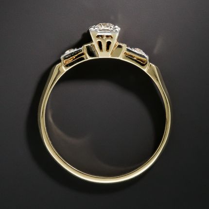 Sweet and petite, this two-tone 14K gold Mid-Century engagement ring is adorned with a glittering trio of diamonds-- a European-cut center stone, accented on either side with round brilliant cuts. Darling. Total diamond weight, .18 carat. Currently ring size 7 1/2+.