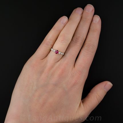 Rubies do not come any redder or as bright as this beautiful little gem. Weighing just shy of a half-carat, the clean, crystalline gemstone radiates between graduated trios of bright white, round brilliant-cut diamonds set in finely beaded collet settings. This delightful high-quality estate jewel, crafted in platinum, makes a superb alternative engagement ring Currently ring size 6 1/4.