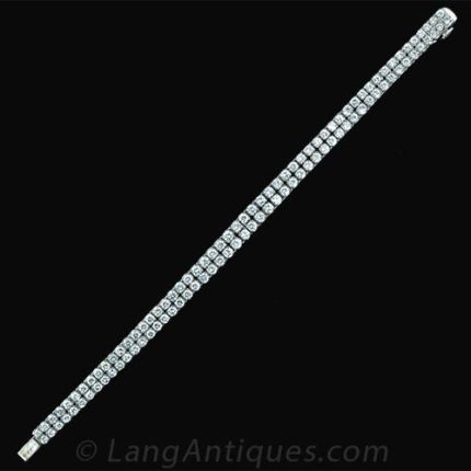 Contemporary 18K white gold Piaget diamond two row graduated bracelet set with round brilliant cut diamonds (108 total, 5.65 carats total weight, F-H color, VS clarity). This bracelet has a box clasp and measures 1/4 wide by 6 1/2 long.