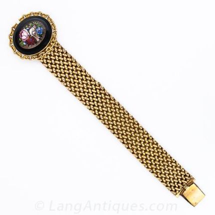 A classic pietra dura portrait of ruby crested bird resting among a lovely combination of flowers in full bloom. It is bordered by a chain frame finished with a heavy mesh bracelet in 10 karat gold