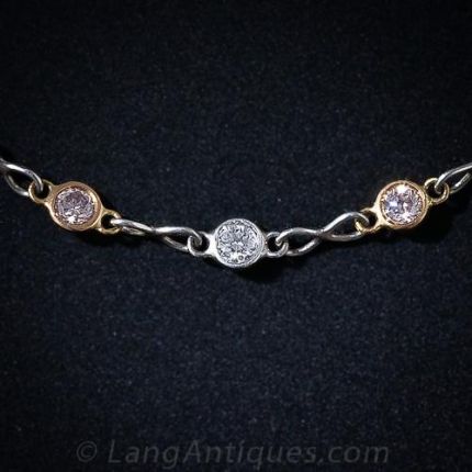 A glistening necklace of white diamonds bezel set in platinum alternating with pink diamonds bezel set in 18 karat rose gold. Forty-one sparkling diamonds totaling 1.85 carat. An unusual and versatile piece for your collection.