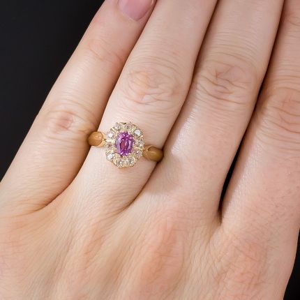 An angelic pink sapphire, weighing three-quarters-of-a-carat, is lit up all 'round with a glittering halo of antique cushion-cut diamonds totaling half-a-carat. A heavenly Victorian beauty divinely rendered in 18K gold, in a finger size 7.