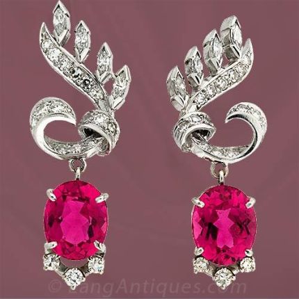 Pretty in pink! Platinum pink tourmaline and diamond drop earrings featuring two prong set oval cut bright pink tourmalines (5.70 carats total weight) with round brilliant and single cut diamond accents dangling from a swirling foliate motif set with marquise and single cut diamonds (44 total, 1.40 carats total weight, G-I color, VS-SI clarity), circa 1950s. Earrings measure 1 1/2 X 1/2.