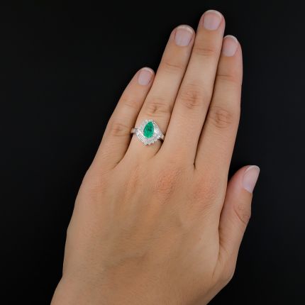 A bright, vibrant, green pear shape Colombian emerald, weighing 1.10 carats, glistens and glows from within a stylish mounting, rendered in gleaming platinum and sparkling with mirror-image arrays of bright white baguettes and double rows ofl round brilliant-cut diamonds for a gorgeous effect. 9/16-inch, currently ring size 6 3/4.